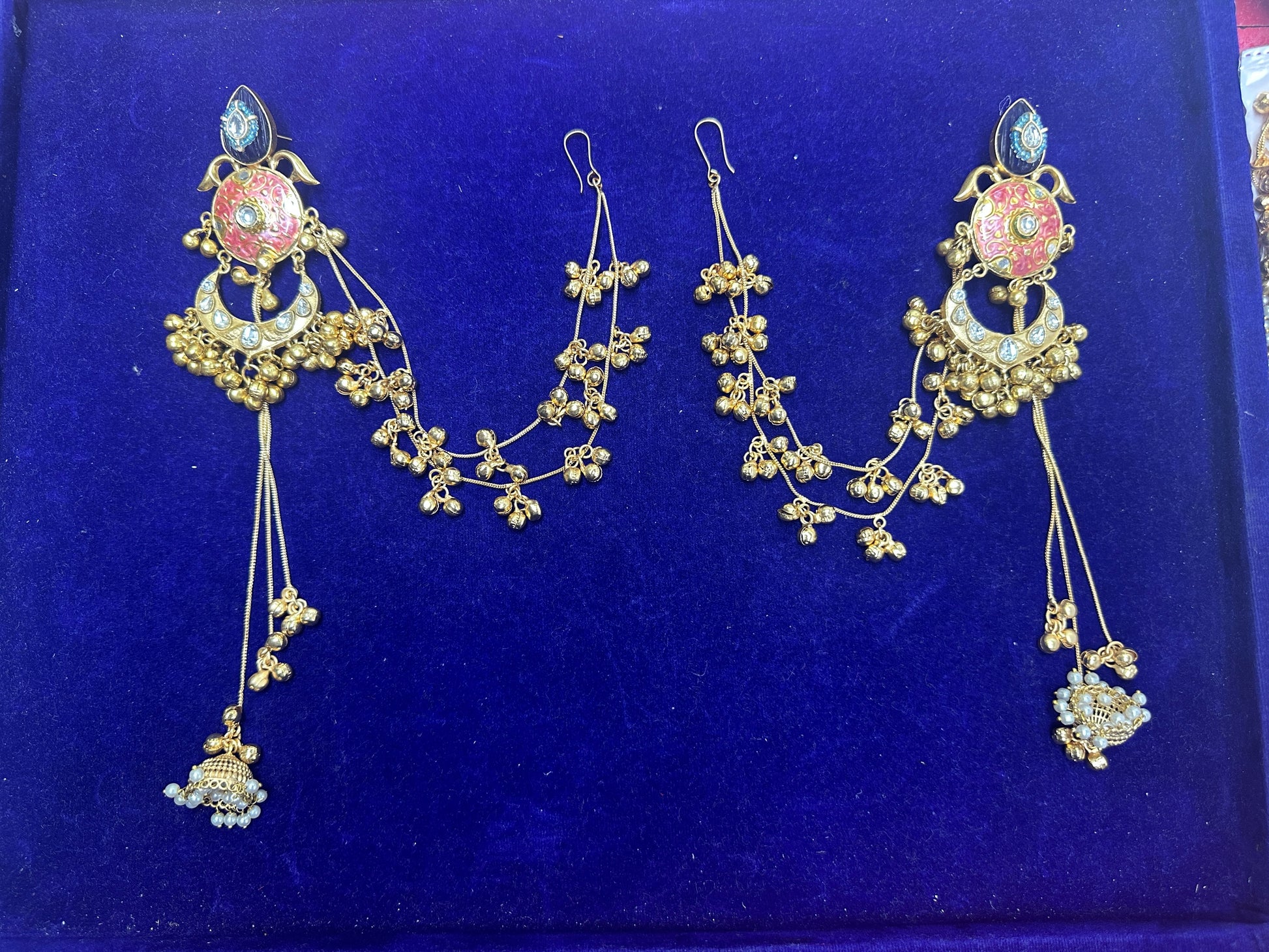 • Signature Bahubali Style: Includes elegant, multi-layered Sahare (ear chains) adorned with delicate gold-tone bells (ghungroos). These chains hook into your hair, providing a majestic look while offering support for the earrings.