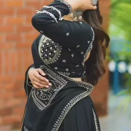 Make a bold statement with this luxurious black muslin silk lehenga choli, adorned with intricate full handwork embroidery that exudes richness and elegance. The deep black silk base highlights the craftsmanship, making it a showstopper for grand occasions. With its voluminous 9–12 meter flair, this outfit flows with grace and sophistication, perfect for creating that unforgettable royal look.